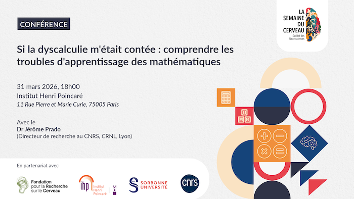 Dans le cadre de la Semaine du Cerveau, la Fondation pour la Recherche sur le Cerveau et l’Institut Henri Poincaré proposent une conférence sur le thème de la dyscalculie. Cette conférence sera donnée par Jérôme Prado (CNRS). La dyscalculie, aussi appelée trouble spécifique des apprentissages en mathématiques, touche environ 5% de la population, soit autant d’enfants que la dyslexie. Étant donné la place grandissante des mathématiques dans nos sociétés, la dyscalculie peut présenter un impact important dans nos vies professionnelles et personnelles. Pourtant, ce trouble reste relativement peu connu et compris du grand public et des enseignants. Pourquoi certains enfants…