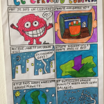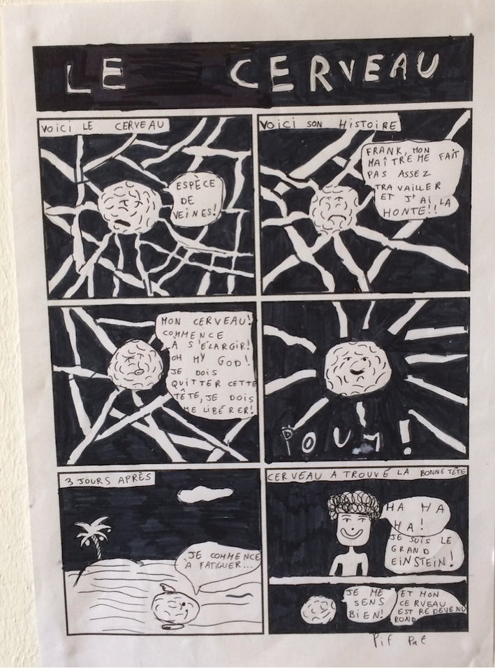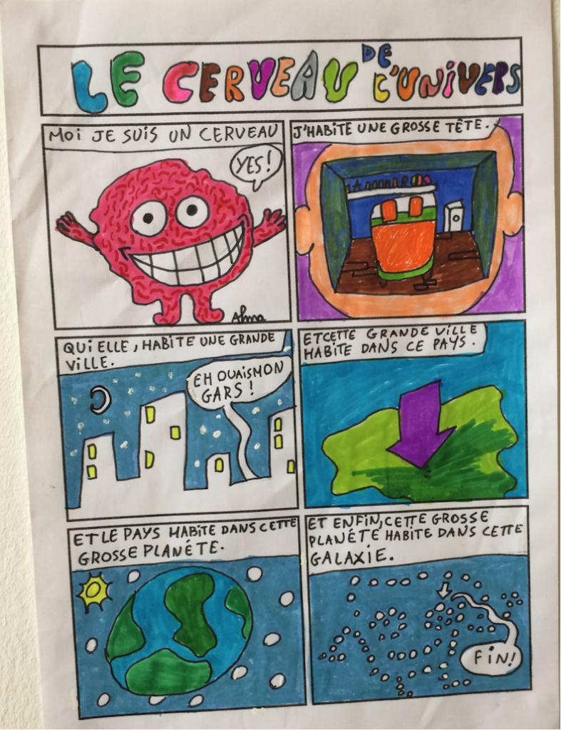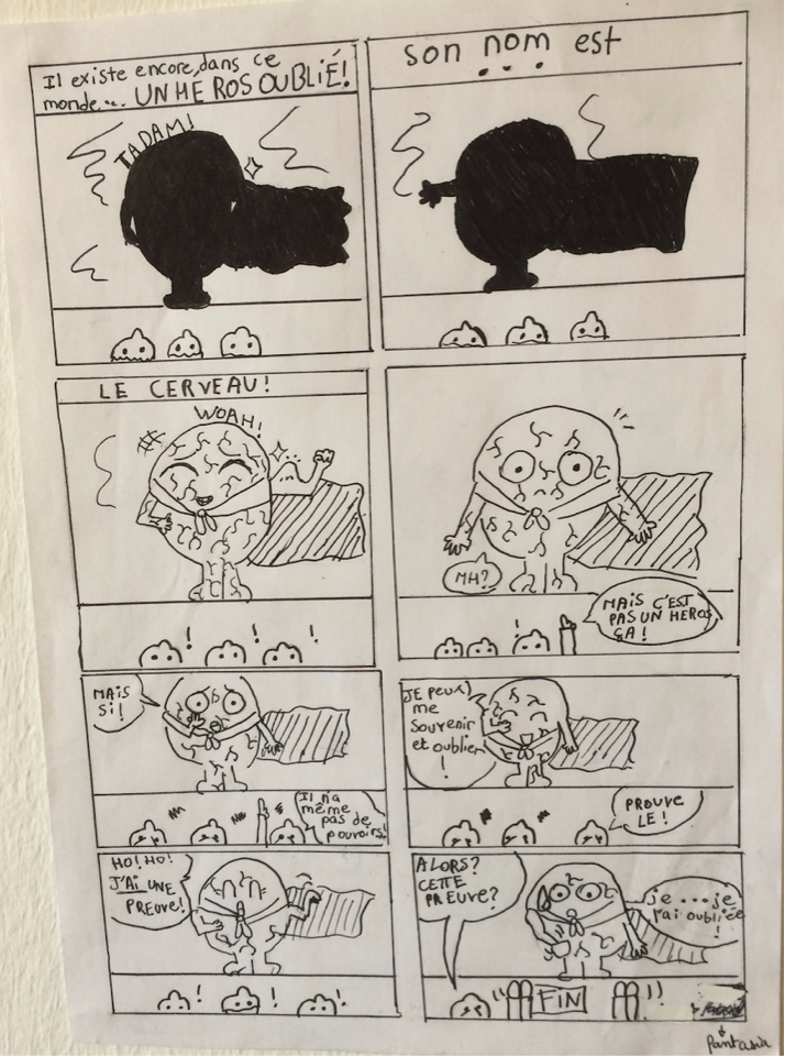 En mars 2019, pour la première fois, la Semaine du Cerveau s’est invitée aux ateliers BD de la Maison Populaire de Montreuil. Pas facile ce sujet du cerveau, surtout lorsqu’on a entre 9 et 11 ans ! Quelques données d’anatomie, quelques idées de « comment ça marche » et quelques mystérieuses photos de neurones. Et hop ! il n’en faut pas plus pour que la boite à idées commence à bouillonner. Mais le scénario n’est pas tout ! Babet, le professeur, apprend comment harmoniser les plans, les dialogues et les scènes. Encore quelques des conseils pour mieux utiliser la lumière et les contrastes Et voilà le cerveau en Super Héros de Bandes dessinées !